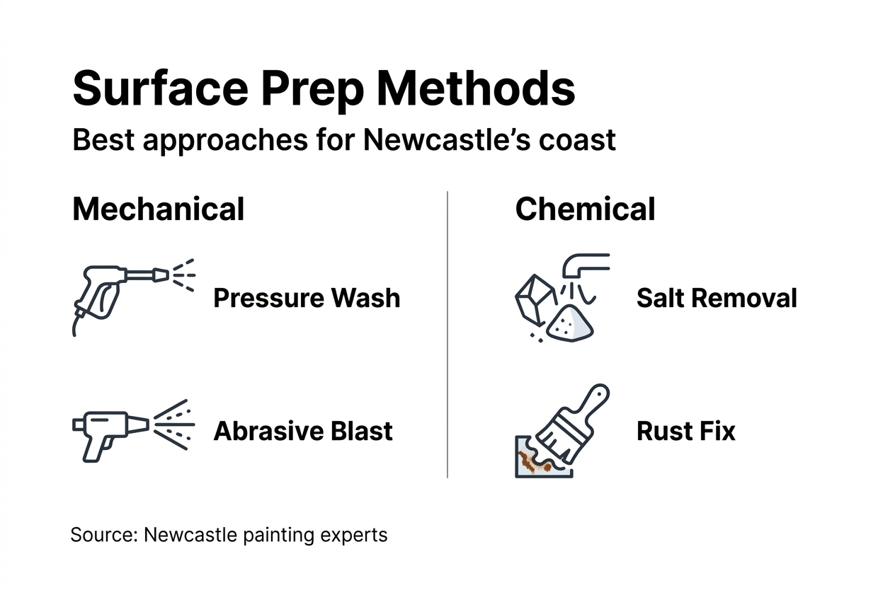 Successful surface preparation follows a systematic approach. Skipping steps or rushing through creates weak points that fail under coastal exposure. Here's how Newcastle property managers and homeowners should proceed: